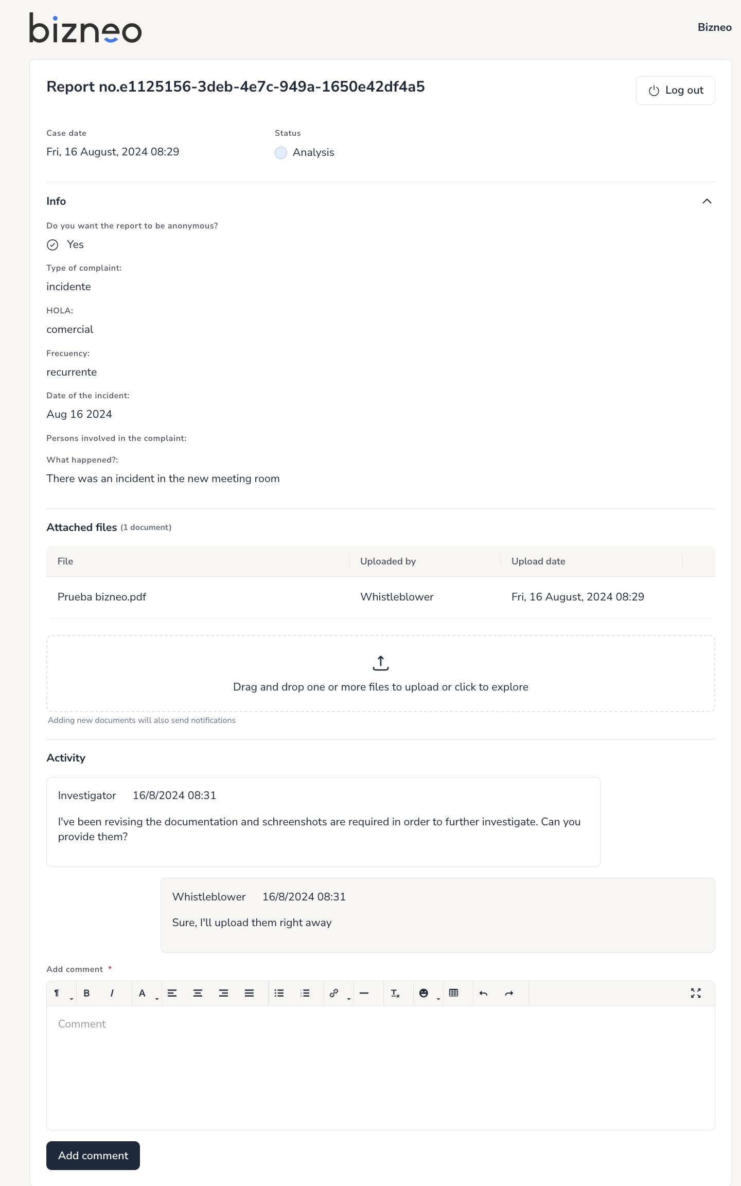 Here you will find a form with the fields that your company has set and with the option to upload documents.