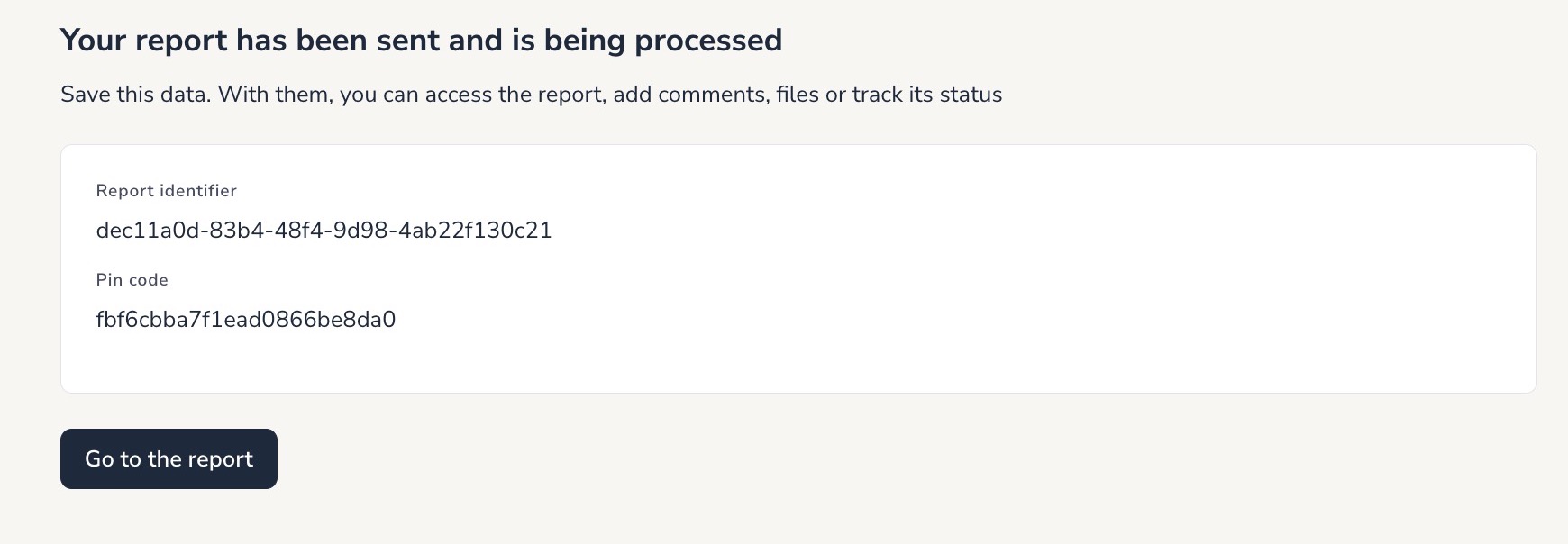After clicking on the Save button to submit the report, you will see a verification message and a new page with the Identifier and the Pin, which will be required to view the details of the report in the future.