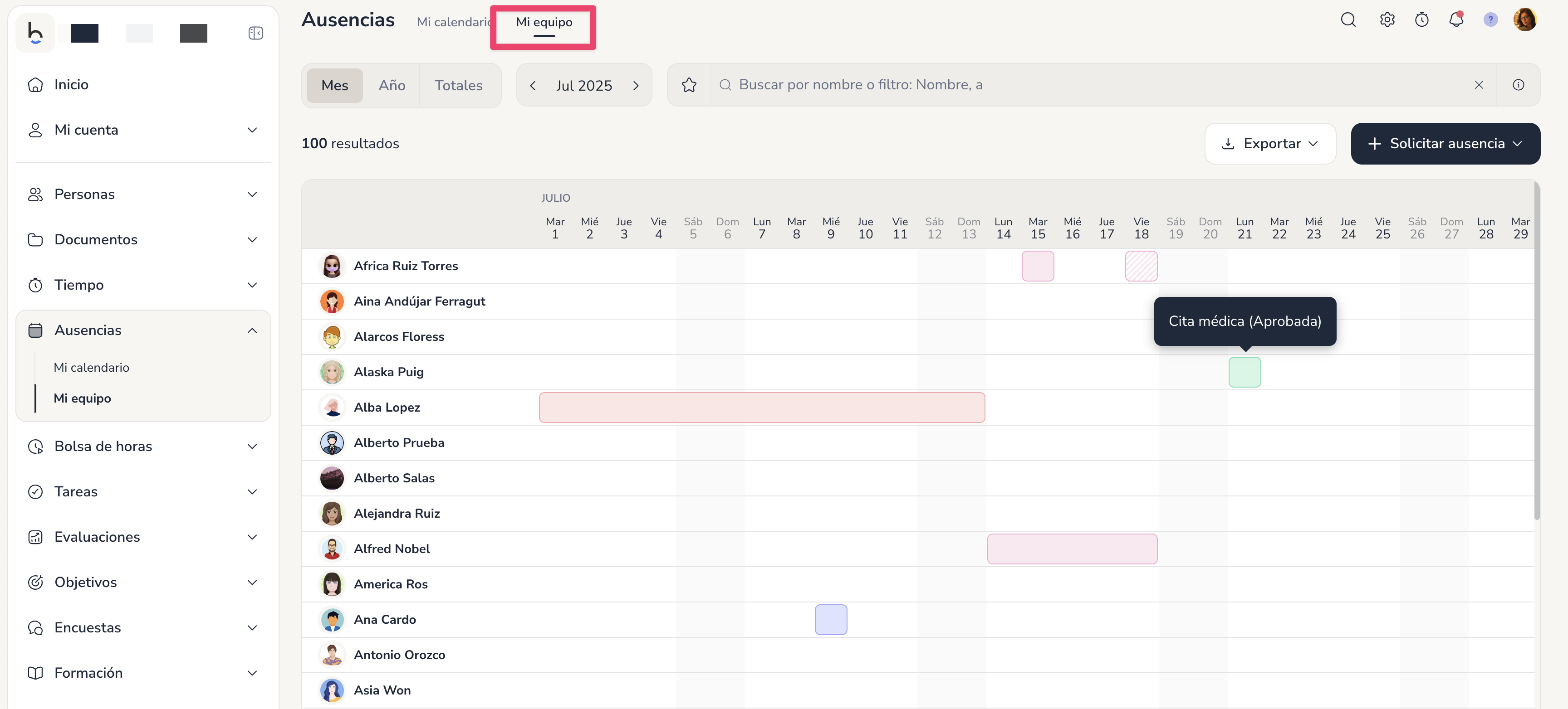 Si tu empresa lo tiene habilitado, en Ausencias > Mi Equipo podrás ver una tabla con tus compañeros y las ausencias y vacaciones que han solicitado.
