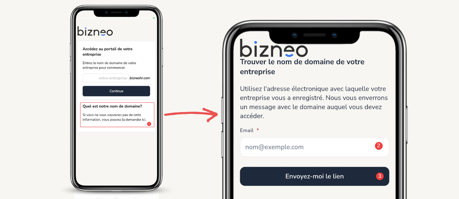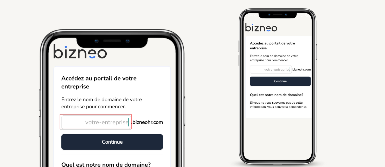 Si vous connaissez l'url pour se connecter à la plateforme Bizneo de votre entreprise, le nom de domaine est ce qui vient juste avant .bizneohr.com. Autrement dit, l'url web sera : NOMDEDOMAINE.bizneohr.com