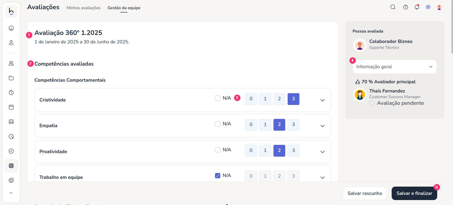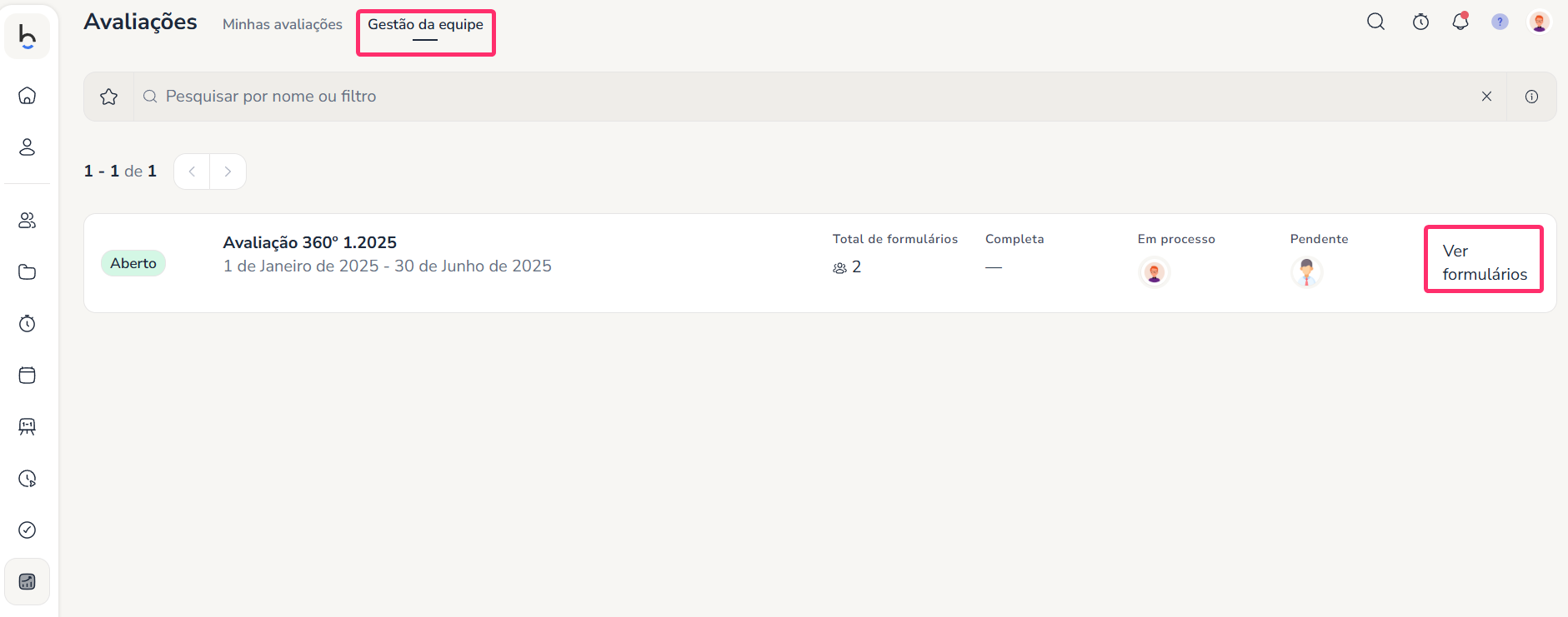 Em Avaliações > Gestão da Equipe estão todas as avaliações onde temos formulários para avaliar, incluindo autoavaliações.