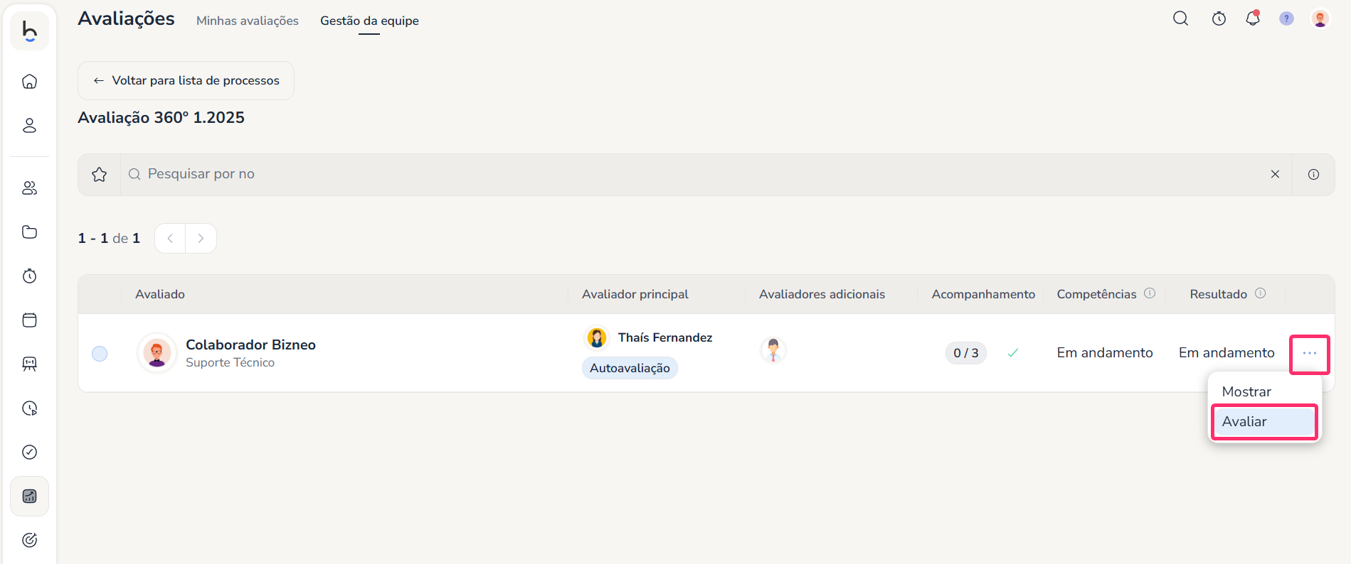 Veremos uma tabela com os avaliadores desse processo e o progresso. Aqui clicamos nos três pontinhos e em Avaliar: