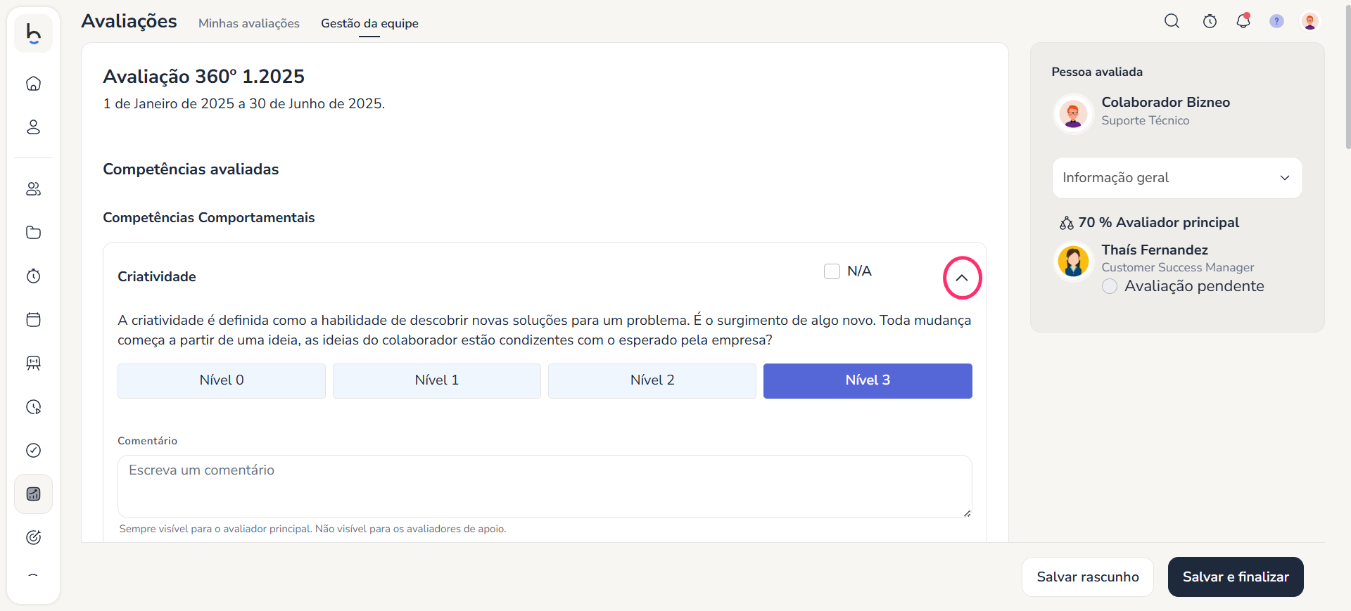 - Clicando na seta de cada competência, veremos o detalhe dos níveis e poderemos escrever um Comentário