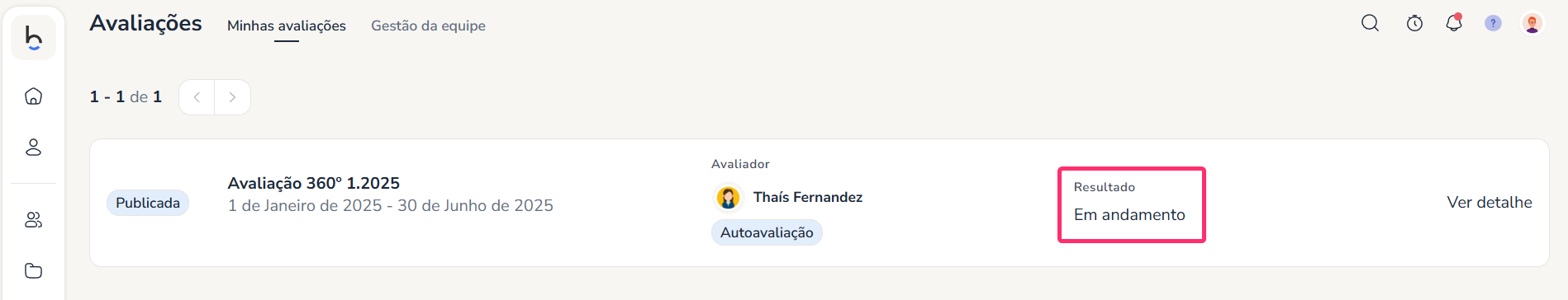 Se o avaliador principal ainda não tiver encerrado o processo, aparecerá “Em andamento” e o resultado não poderá ser visualizado: