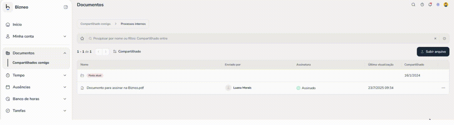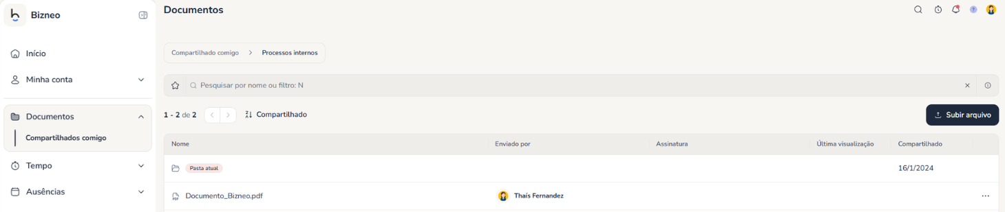 Como você só poderá enviar documentos nas pastas que sua empresa tiver habilitado para isso, caso não veja o botão Enviar arquivo em uma pasta, por favor, entre em contato com seu responsável.