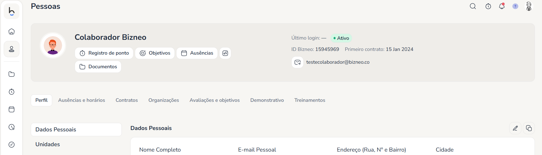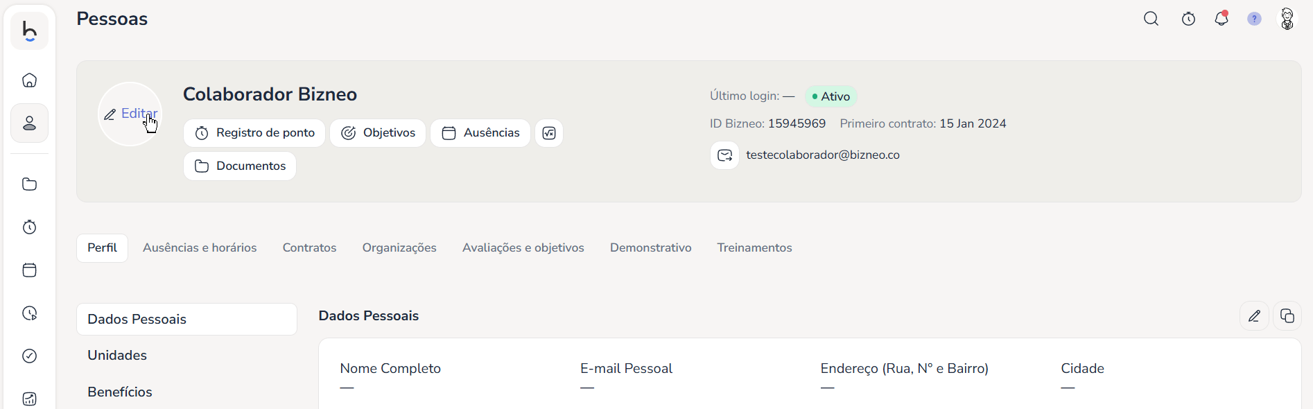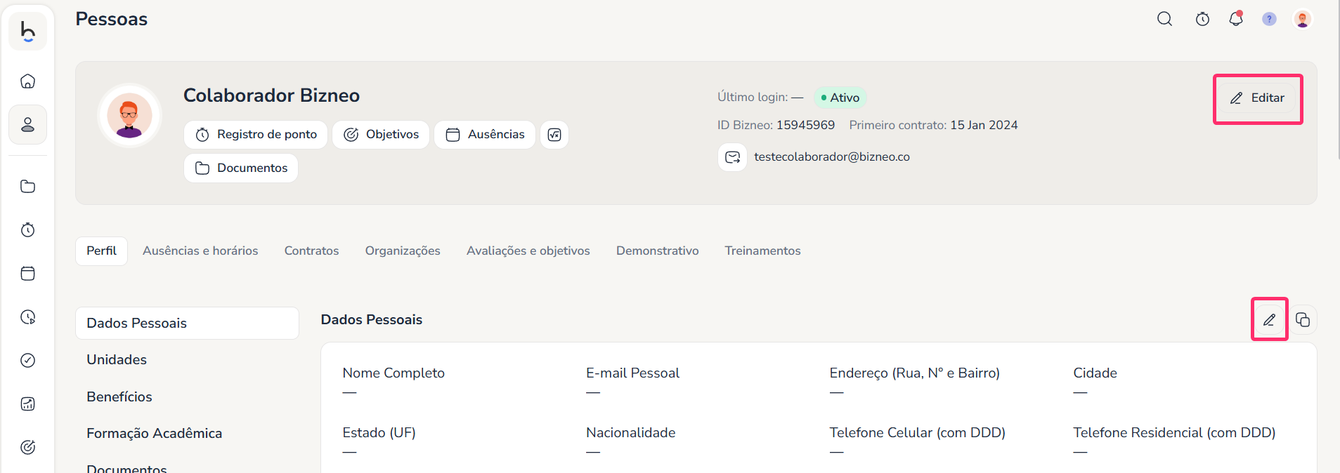 Se sua empresa permitir a edição dos dados, você verá um ícone de edição (✏️) em cada seção: