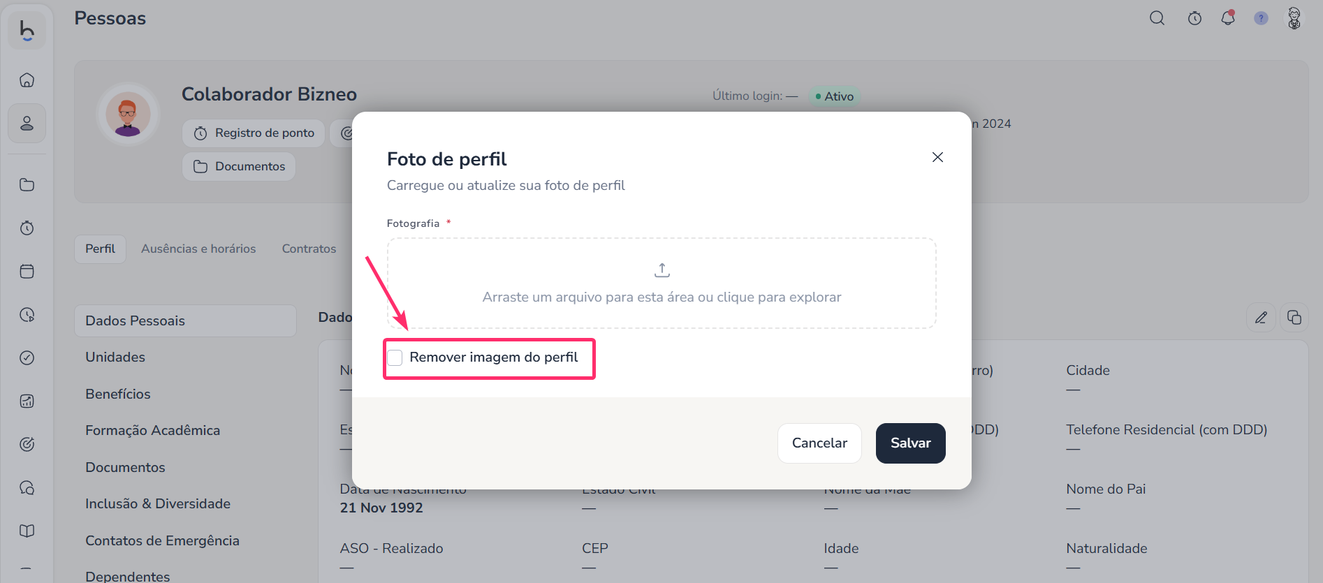 Se, em vez de trocá-la, você preferir removê-la, na janela que será aberta é possível selecionar a opção Remover foto de perfil e clicar em Salvar: