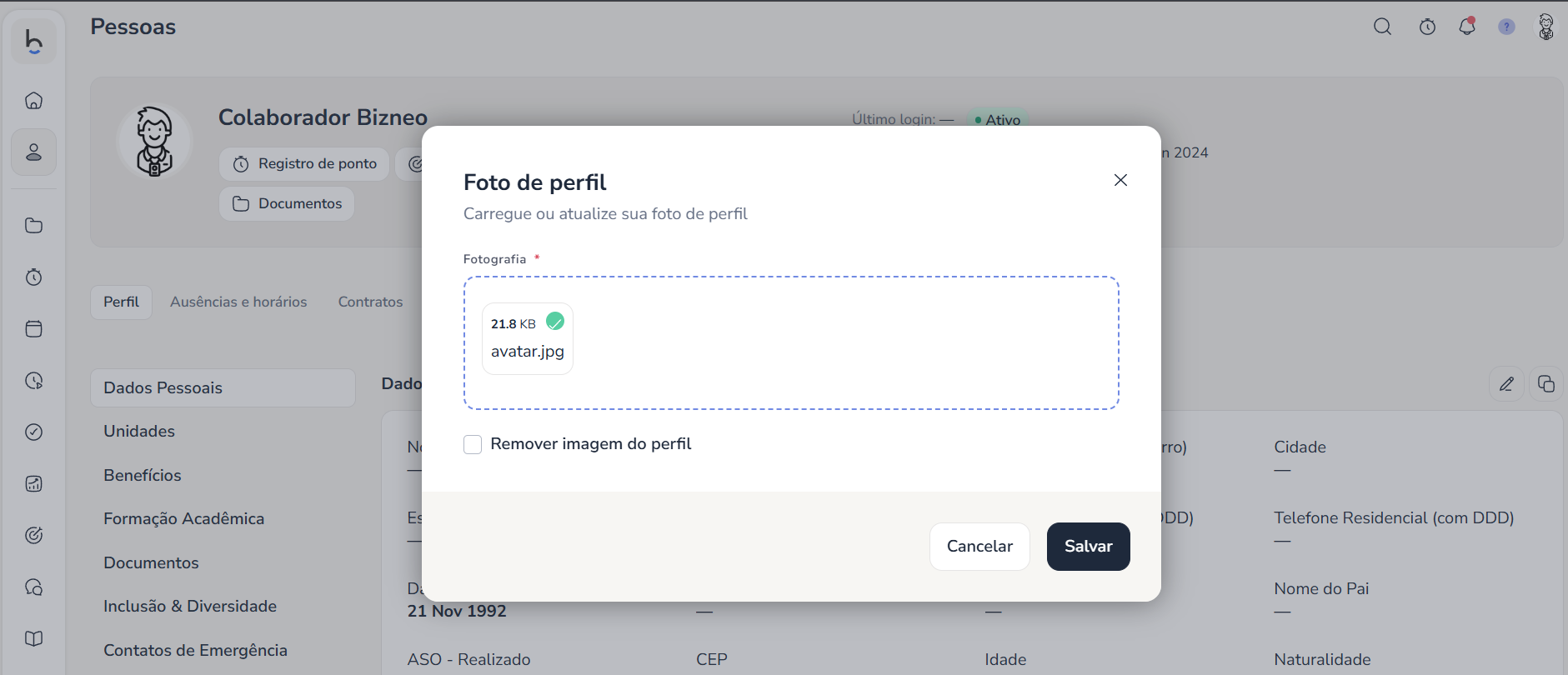 Ao clicar, será aberta uma janela com os campos que você tem permissão para editar. Você pode modificar o que for necessário e, quando estiver tudo certo, clicar em Salvar: