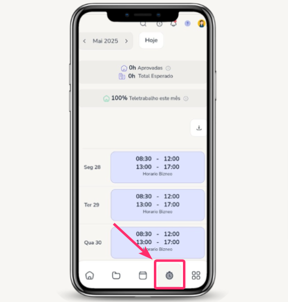 Em Tempo > Meu Horário você pode verificar sua programação de horário para este mês. Essa tela mostra: